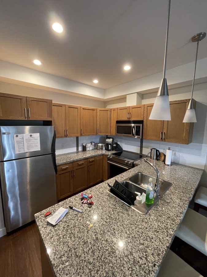 Fully equipped kitchen incl: stove/oven, full-size fridge/freezer, dishwasher, microwave, Keurig & regular coffee maker, dishes & silverware, cookware (pots, pans/utensils) and breakfast bar.