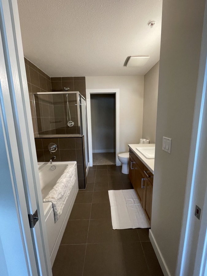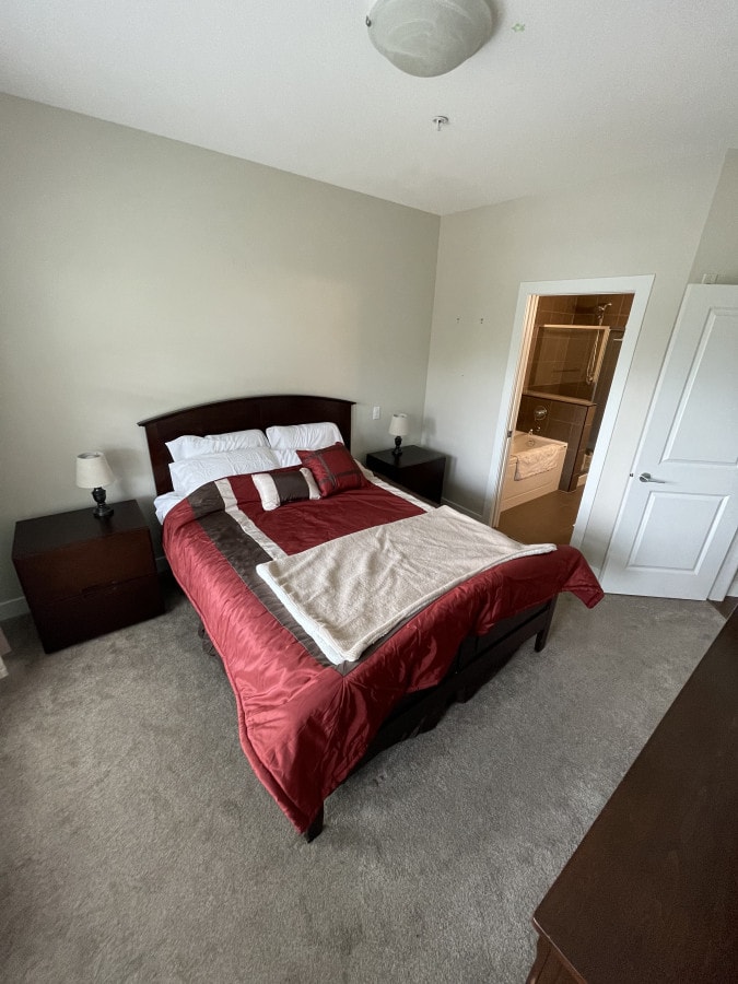 The master bedroom features a comfy Queen bed, TV, dresser, en-suite, & walk-in closet. The en-suite includes a separate tub & shower, vanity, and toilet.